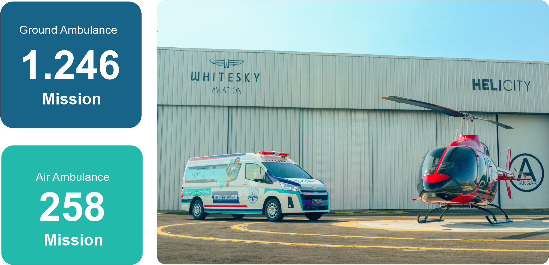 Sarana transportasi didukung oleh ambulans darat, laut, maupun Udara dengan rute domestik atau internasional, untuk memberikan solusi efektif dan efisien selama proses evakuasi medis.